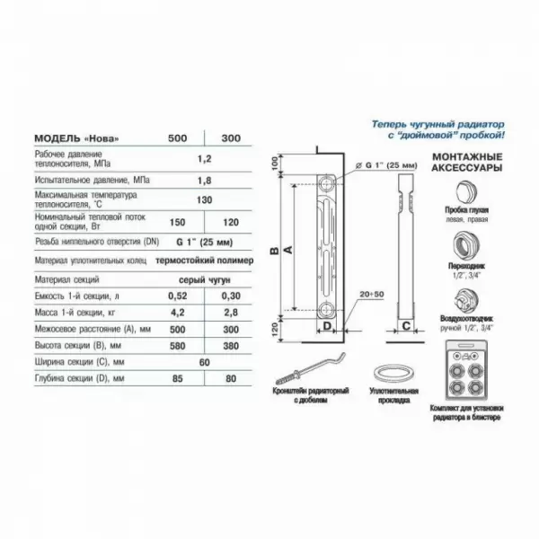 Чугунный радиатор STI Hова 500 характеризуется следующими показателями: