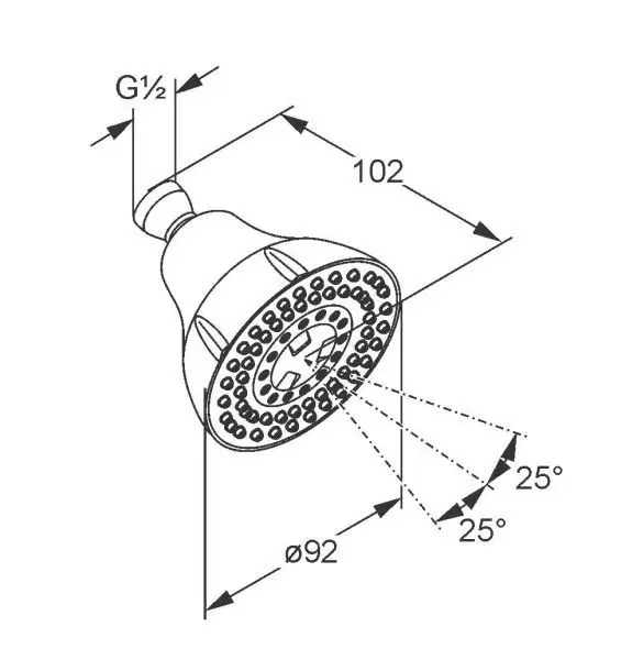 Верхний хромированный душ FRESHLINE 100 6219105-00 с системой против известковых отложений. Душ с дождевой струей на шарнире. Класс расхода воды В, класс шума I. Монтаж настенный или потолочный, подключение 1/2".