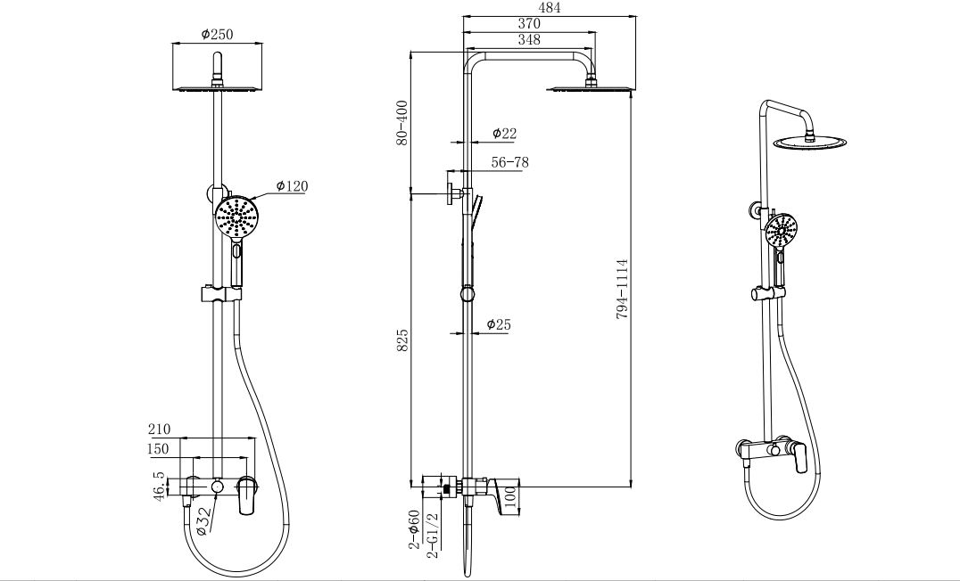 регулируемая душевая штанга из нержавеющей стали, выдвигающаяся до 1114 мм в высоту
