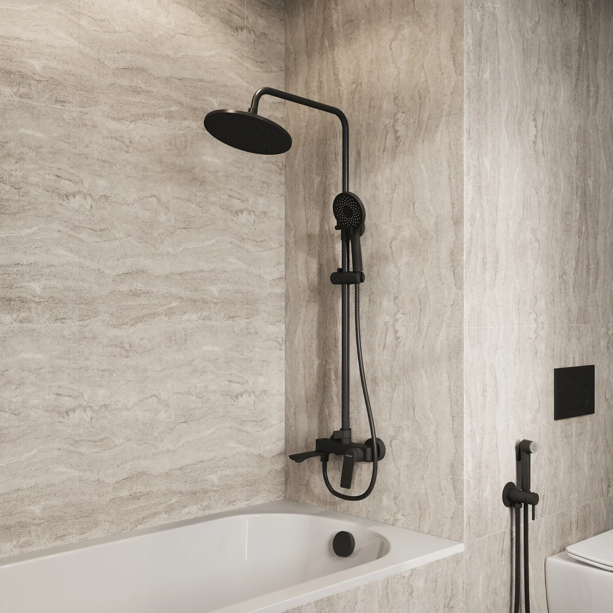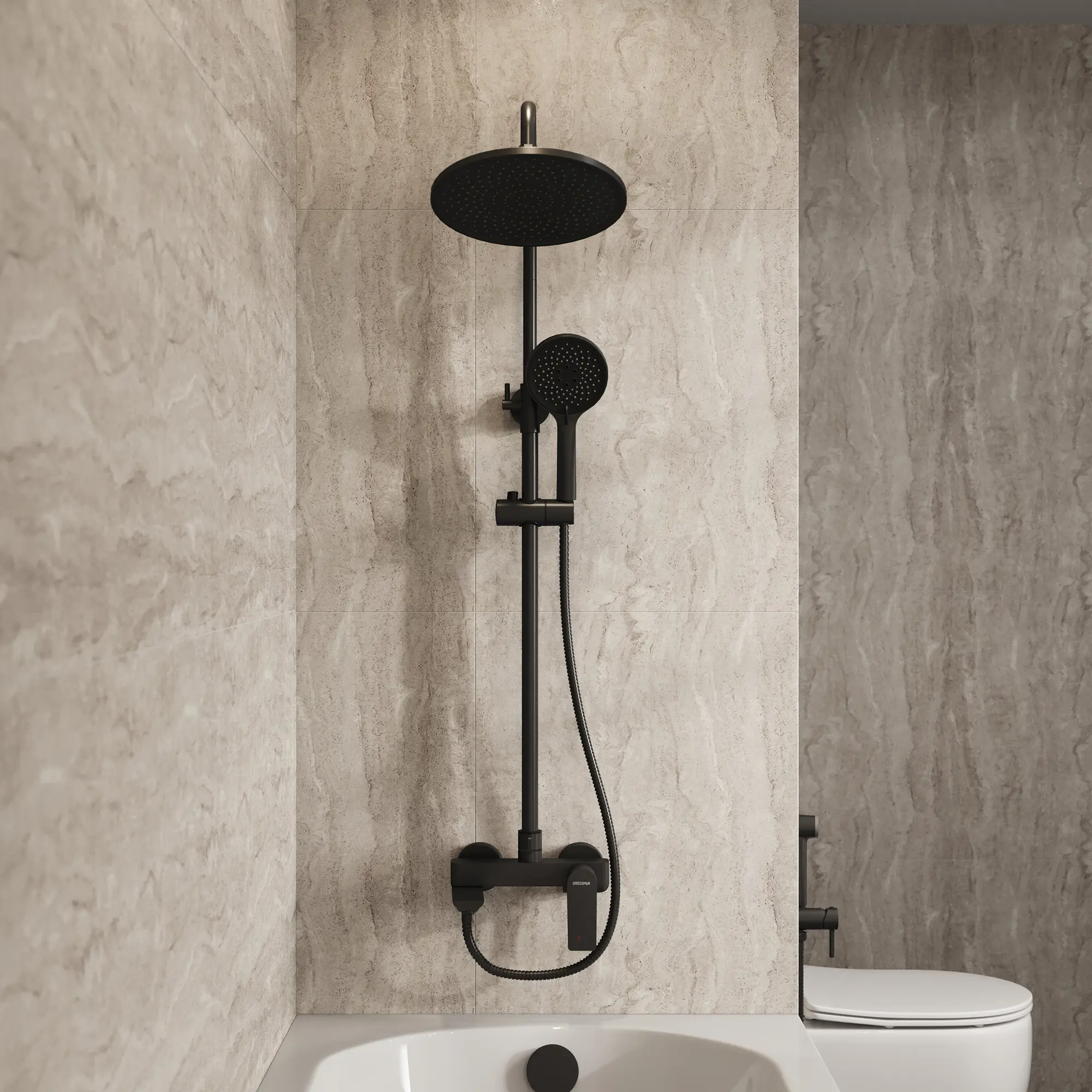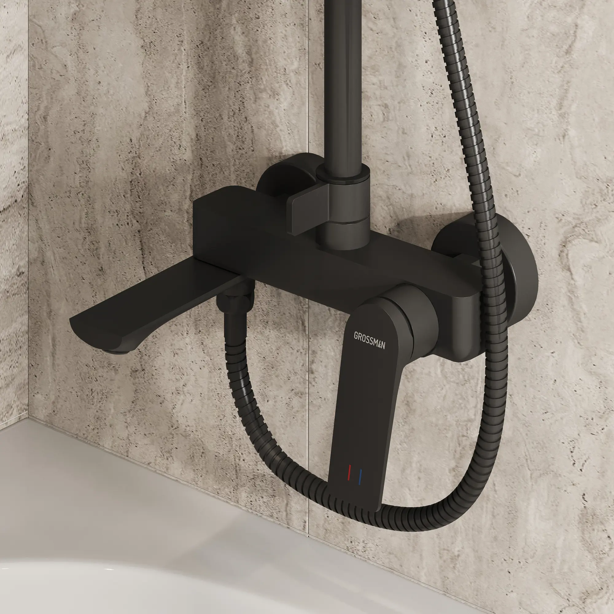 Душевая стойка Galaxy 500.K35.01.210 ТМ GROSSMAN в черном матовом исполнении с тропическим душем, лейкой и изливом - это идеальное сочетание высокого качества и доступной цены. Она подходит для установки в душевых углах, перегородках, а так же над ванной. Ключевые особенности: