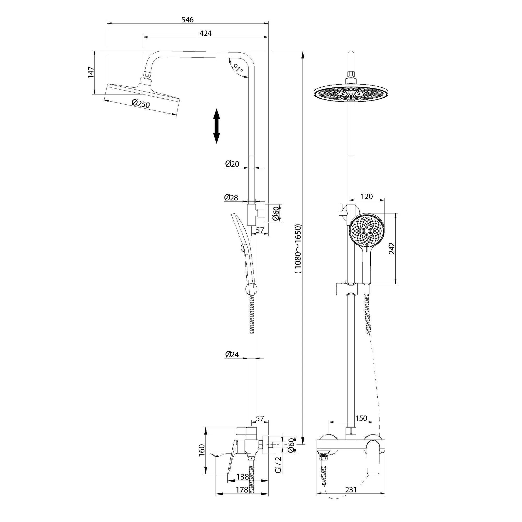 Телескопическая душевая стойка позволяет изменять высоту до 165 см, что делает использование комфортным для людей разного роста.