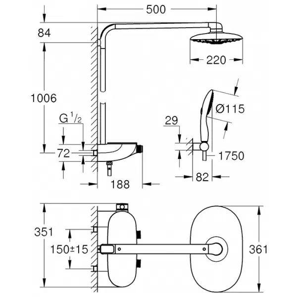 - Душевая система с термостатом для настенного монтажа включает в себя: