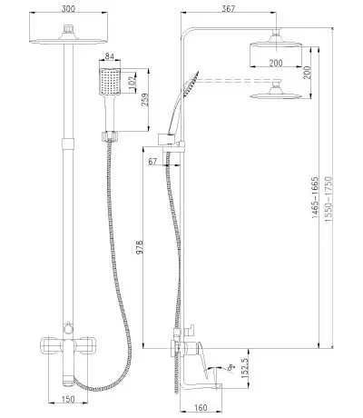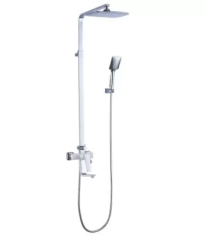 Смеситель для ванны и душа с регулируемой высотой штанги, поворотным изливом и верхней душевой лейкой "Тропический дождь"