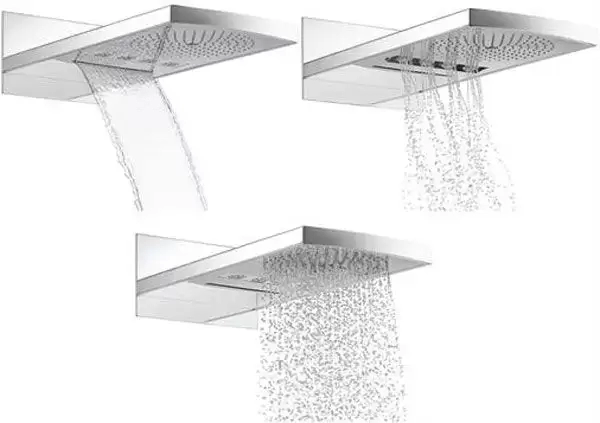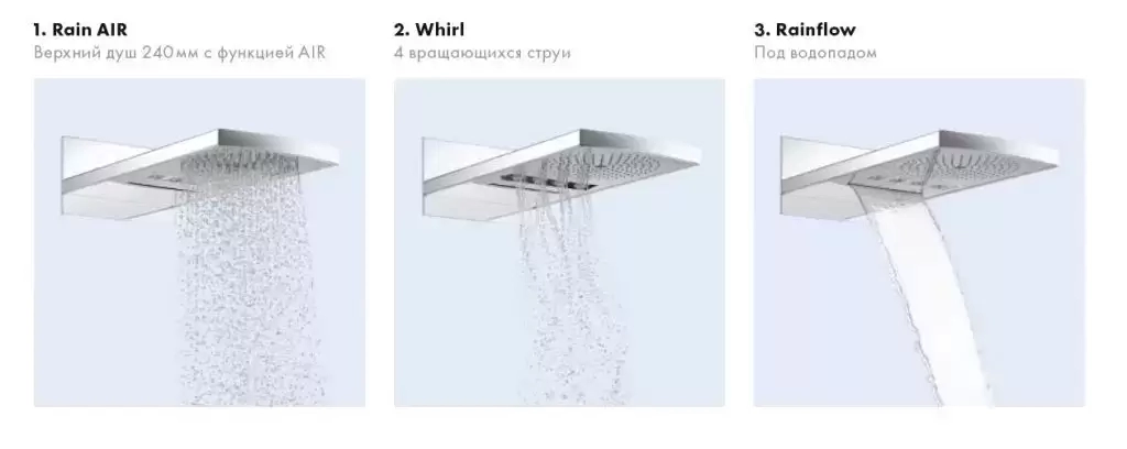 3 типа струи: Rain AIR, 240 мм с технологией AIR, Whirl с 4-мя подвижными форсунками, Rain Flow шириной 176 мм
