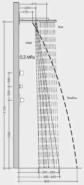Расход воды при 0,3 MPa около 40 л/мин (Rain Flow), душевая струя – 21 л/мин