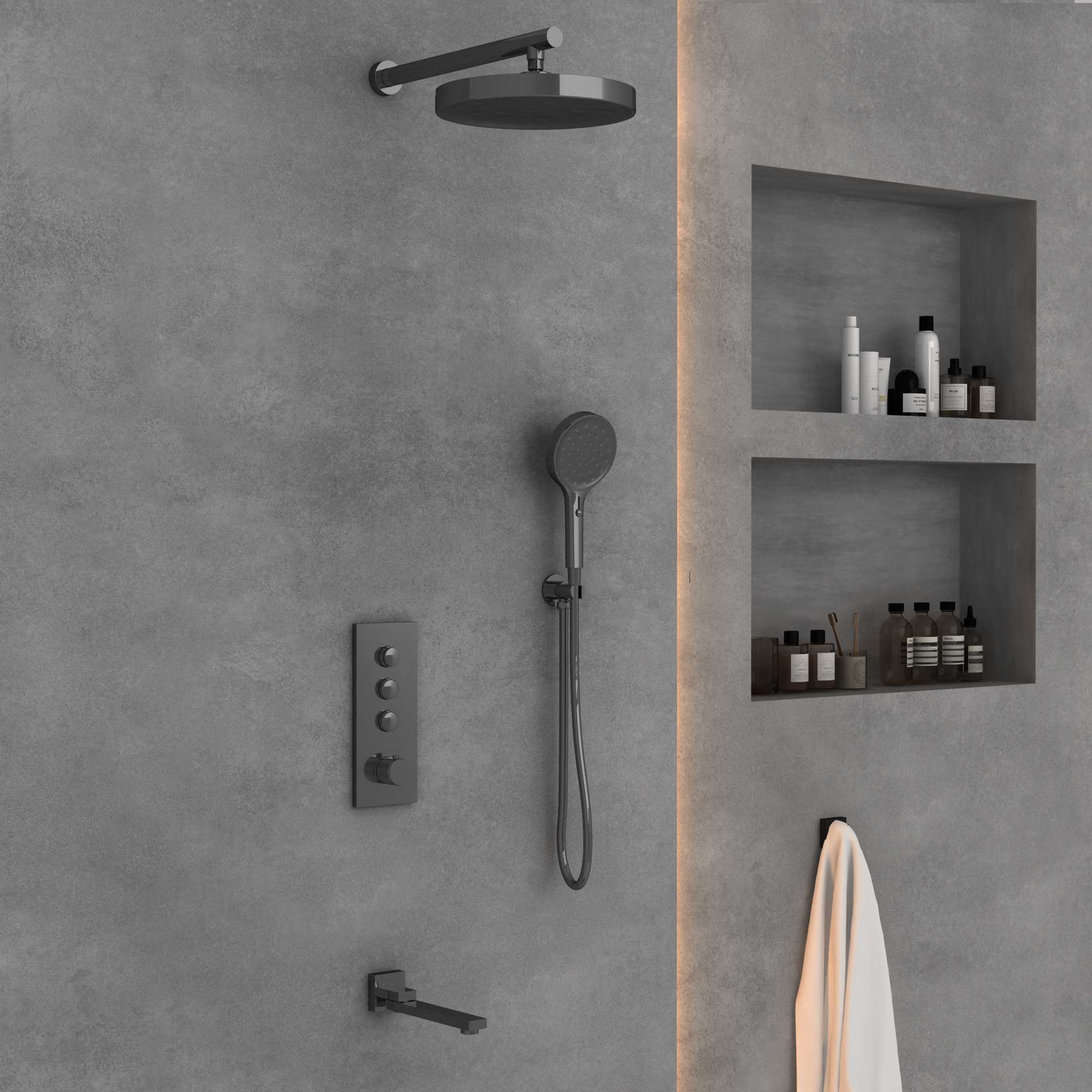 Наша встраиваемая душевая система Inspire вороненая сталь создана для тех, кто ищет совершенство и непревзойденное качество. Она сочетает в себе изысканный стиль и современные технологии, чтобы превратить вашу ванную комнату в истинный уголок расслабления и комфорта. Легкие линии и вороненая стальная отделка придадут вашей ванной комнате изысканность и привлекательность.
