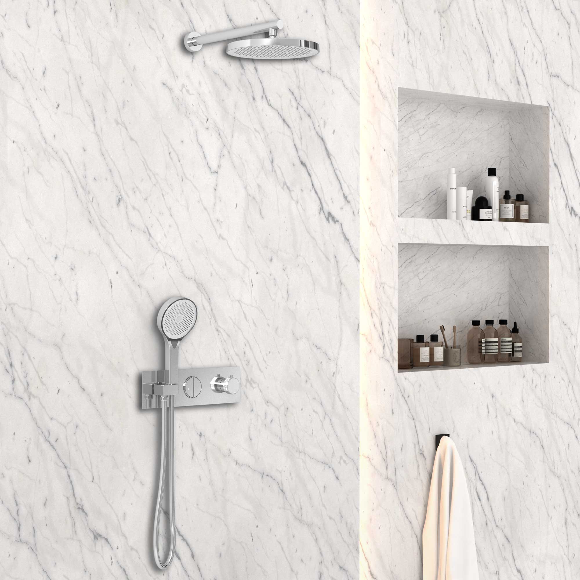 Уникальный термостат позволит вам настроить идеальную температуру воды для вашего исключительного душевого опыта. Переключайтесь между режимами Relax и Revitalize, чтобы насладиться различными ощущениями и восстановить гармонию вашего тела и души. Представьте себе мягкие волны расслабляющих струй в режиме Relax, создающих уютную атмосферу спокойствия и комфорта. А затем погрузитесь в оживляющие струи воды в режиме Revitalize, которые пробудят ваше тело и наполнят вас энергией. Встраиваемая душевая система Vincea в хромированном цвете станет ярким акцентом вашего роскошного ванныго пространства, предоставляя неповторимый душевой опыт каждый раз.