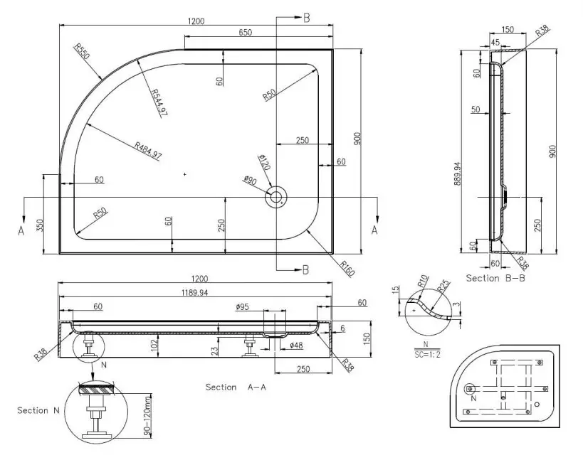 Поддон 900*1200*150 к душ.огражд. AZ-NNQ2131-1-R P2912 R AZARIO