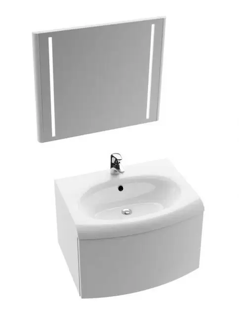 Лаконичный комплект мебели Ravak Evolution состоит из зеркала со встроенными точечными светильниками с выключателем и розеткой, и подвесной тумбы с глубоким выдвижным 3-х секционным ящиком для хранения вещей.