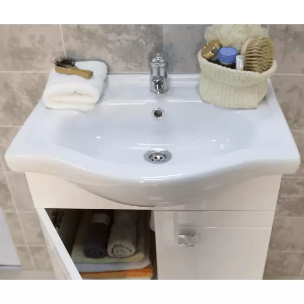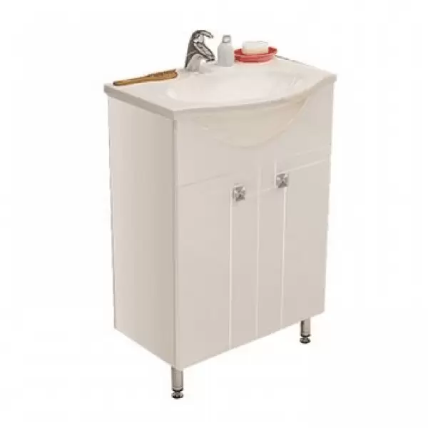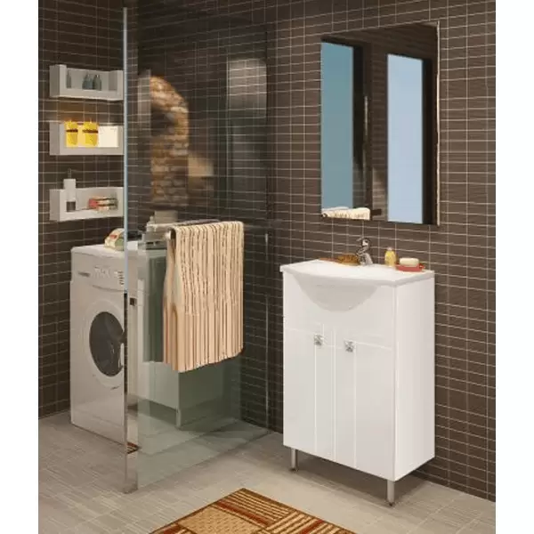 Корпус тумбы выполнен из влагостойкой ЛДСП, фасад - плита МДФ, корпус и фасад выкрашены в белый глянцевый цвет. На тумбе установлены изящные ручки и опоры, регулируемыми по высоте. Тумба комплектуется раковиной раковиной "Селигер-60". Внутри тумбы пространство разделено на 2 части полкой.