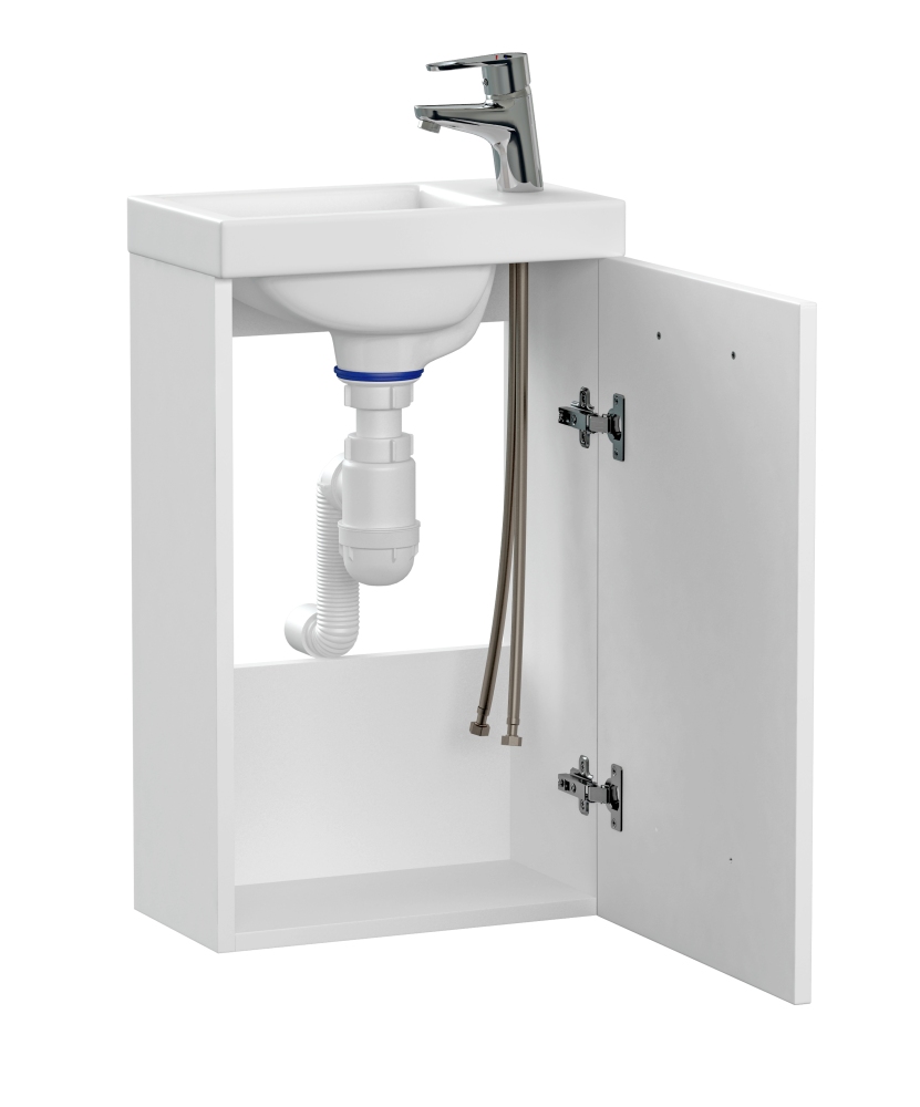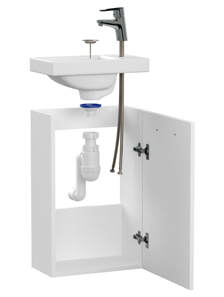 Тумба, раковина, смеситель и сифон сочетаются в дизайне, легко монтируются друг с другом и станут универсальными помощниками в ванной комнате.
