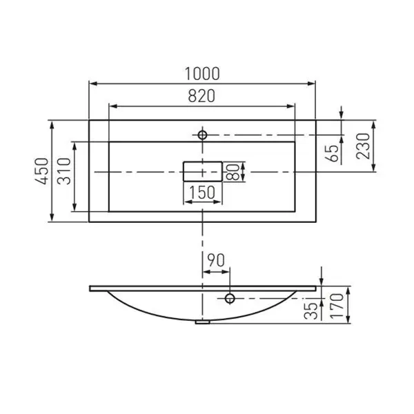 Размеры раковины: длина 100 см, ширина 45 см, высота 17 см.