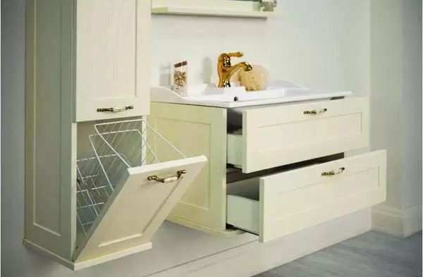 Корпус шкафа-колонны Леон 80 изготовлен из влагостойкого ДСП. Фасад шкафа изготовлен из высококачественного МДФ. В нижней части колонны установлена бельевая корзина, а в верхней – полки. Все петли шкафа снабжены доводчиками.