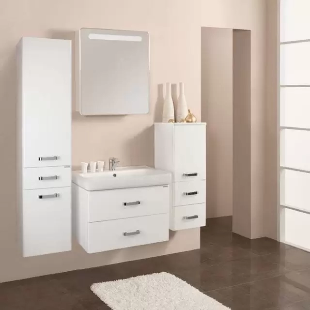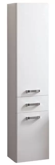 Подвесной полноразмерный шкаф-колонна состоит из трех функциональных частей. Внутреннее пространство верхней части разделяется стеклянными полками. В центральной части располагается выдвижной ящик на металлических направляющих. В нижней части установлена бельевая корзина.