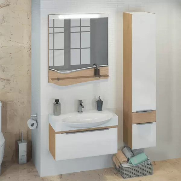 - Подвесной шкаф-колонна отличное решение для хранения разных предметов необходимых в ванной комнате. За верхней дверцей три горизонтальных полки. Створки и выкатной ящик оборудованы системой плавного закрывания