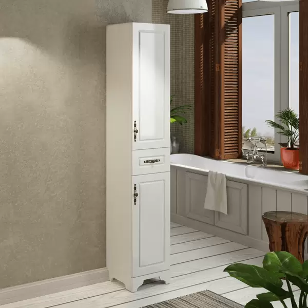 - Верхняя, нижняя створки и ящик оснащены системой плавного закрывания. Фасады покрыты эмалью оттенка Слоновая кость.