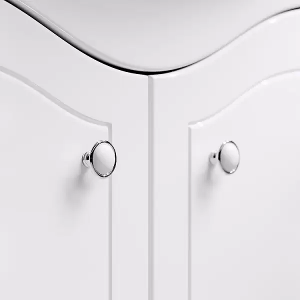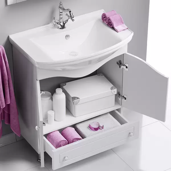 Фасады коллекции производятся из МДФ (древесново-локнистой плиты повышенной плотности) и покрыты 5-ю слоями белой глянцевой эмали. Боковины из ЛДСП (древесностружечной плиты повышенной плотности) – также имеют белую глянцевую поверхность. Коллекция представлена напольными тумбами в четырех размерах: 65, 75, 85 и 105 см по ширине. Гарнитуры комплектуются керамическими умывальниками производства завода «KIROVIT» – коллекция Стиль. Для удобства открывания тумб используются хромированные металлические ручки с керамическими вставками итальянского производителя BosettiMarella. Нижний ящик в тумбах 65,75 и 85 см оснащен скрытыми направляющими австрийской фирмы Blum с системой мягкого закрывания, на которые производитель дает вечную гарантию. На все двери установлены петли с интегрированным доводчиком, обеспечивающим плавное закрывание.
