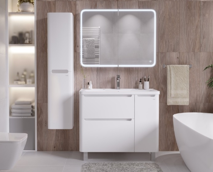 Тумба выполнена из влагостойкого МДФ покрытая белой глянцевой краской, устойчивая к перепадам температур и высокой влажности, крепится к стене.