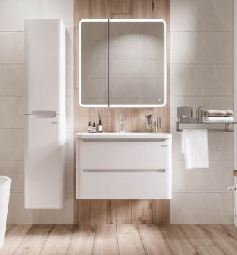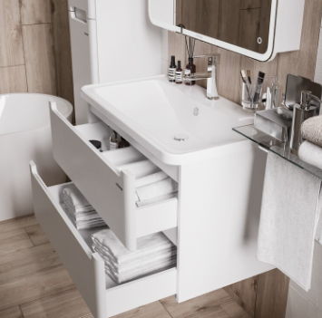 Тумба выполнена из влагостойкого МДФ покрытая белой глянцевой краской, устойчивая к перепадам температур и высокой влажности, крепится к стене и занимает мало места.