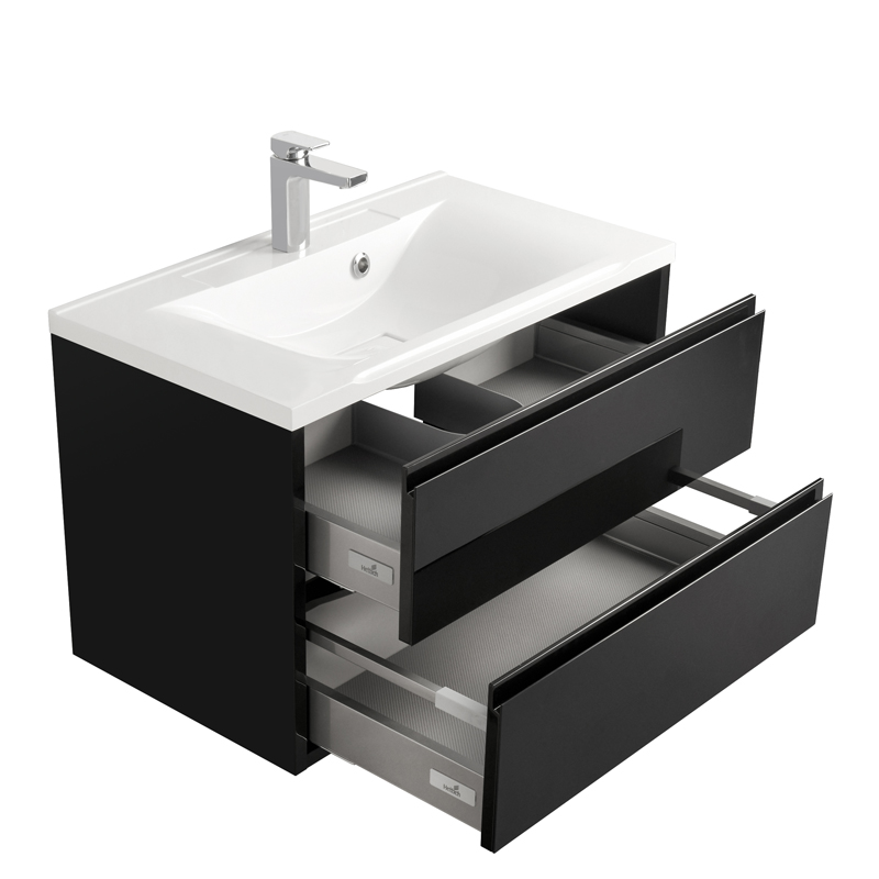 Тумба Римини 80 от бренда AQUATON - лаконичное решение тех, кто предпочитает строгий дизайн в безупречном исполнении. Поверхность фасадов удивляет элегантностью и безупречно ровной поверхностью за счет стеклянных панелей, установленных на фасадах, и отсутствия лицевой фурнитуры. Корпус, изготовленный из влагостойкой ЛДСП, и фасады из МДФ, окрашены в чёрный цвет полиэфирной краской ультрафиолетового отверждения с высокой степенью глянца. Тумба имеет два ящика, снабженные системой плавного закрывания. Нижний предназначен для больших предметов, а верхний, имеющий удобную систему организации пространства, - для мелких аксессуаров.