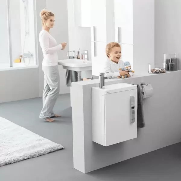 Простой уход осуществляется благодаря форме изделий, материалом отделки и подвесным тумбам.