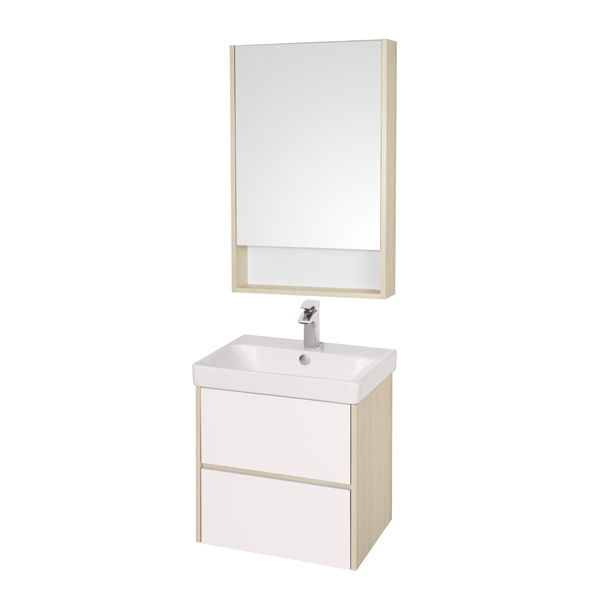 Тумба Сканди 70 выполнена в популярном минималистичном скандинавском стиле. Корпус тумбы выполнен из влагостойкой ЛДСП в декоре натурального дерева, а фасады в белой глянцевой покраске. Конструктивно тумба состоит из 2 вместительных ящиков, установленных на направляющие с интегрированной системой push-to-open для комфортного использования. На тумбе нет выступающих деталей и фурнитуры, открытие ящиков реализовано нажатием на фасад.