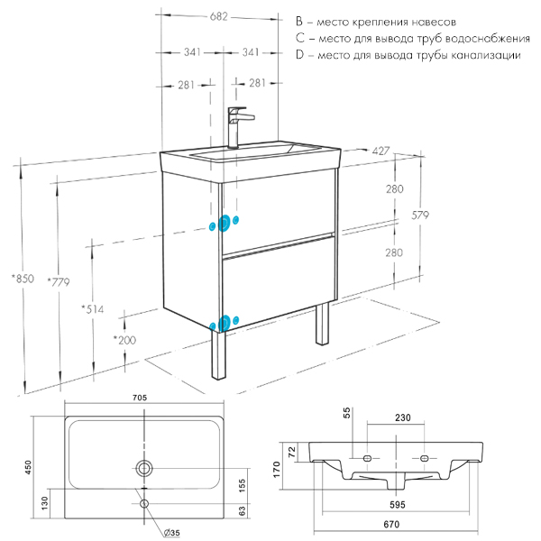 Тумбу по желанию можно использовать в двух вариантах: как подвесную или дополнительно приобрести опоры
