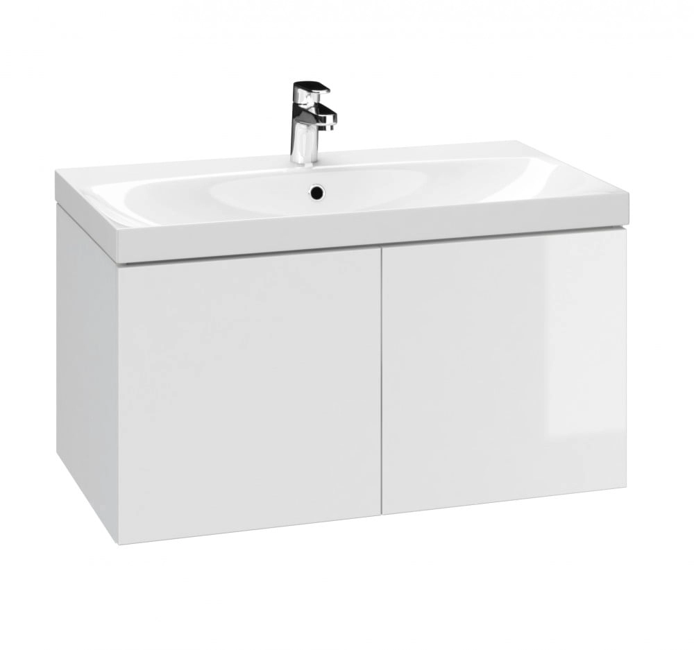 Белые глянцевые фасады, четкие геометрические формы тумбы помогут создать минималистичный и строгий интерьер ванной комнаты.