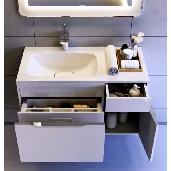Тумба в размере 90 см комплектуется умывальником с тонким бортом, но при этом с глубокой чашей. Также умывальник 90 см имеет зону для удобного расположения предметов, которые всегда нужны под рукой (полотенце, жидкое мыло и т.д.). Умывальник Malaga 90 см может быть правым и левым. В соответствии с умывальником тумба Malaga 90 см может быть в правом и левом исполнении.