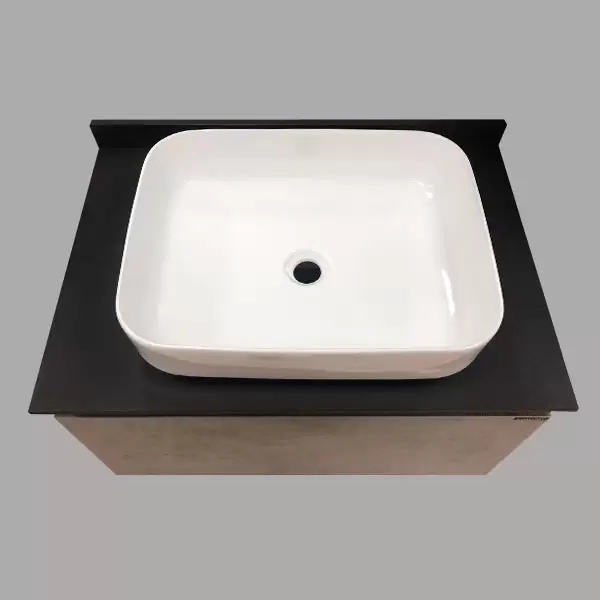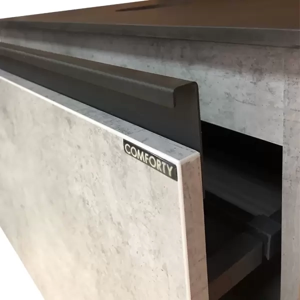 Тумба укомплектована столешницей и плинтусом из черного керамогранита и накладной прямоугольной раковиной Comforty T-Y9378. Корпус и фасады тумбы изготовлена из влагостойкого ДСП цвета "Бетон светлый". Тумба подготовлена для подключения водоснабжения снизу.