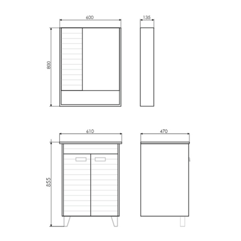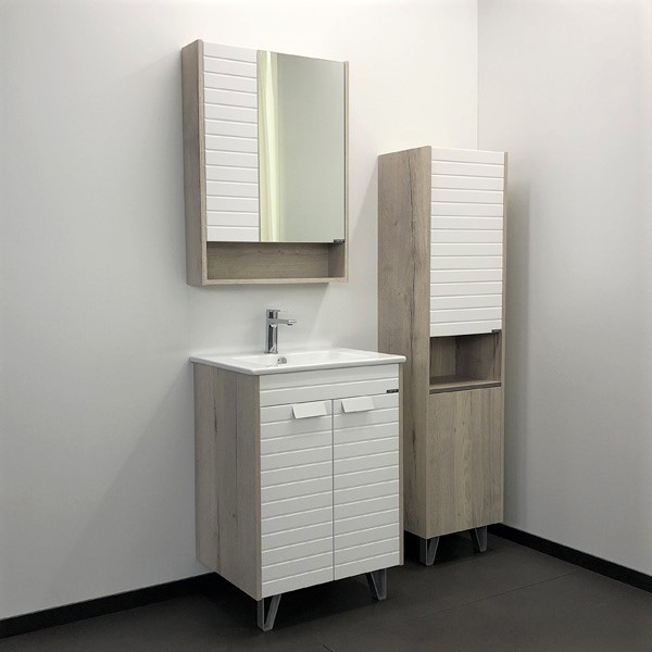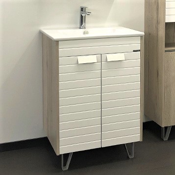 Напольная тумба-умывальник с двумя створками, оснащенными петлями с плавным закрыванием. Фасады тумбы окрашены белой матовой эмалью. На фасадах - фрезеровка горизонтальными полосами. Тумба оснащена декоративными ножками в одном стиле с ручками створок.