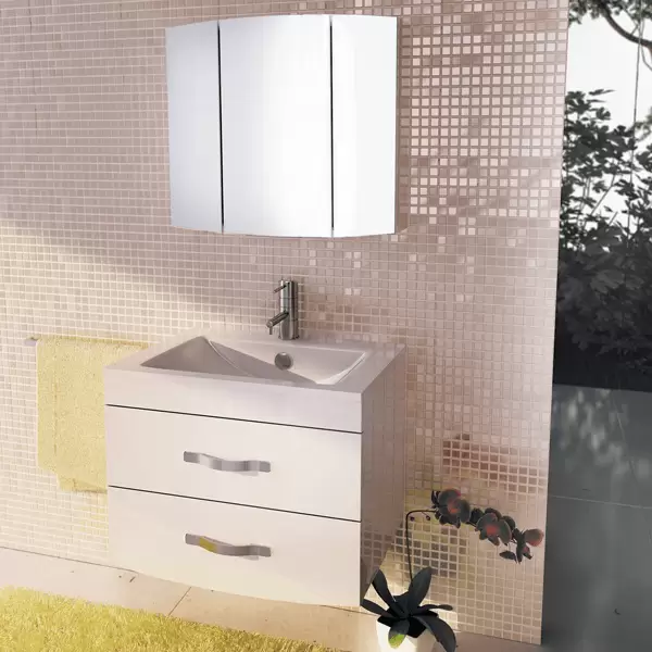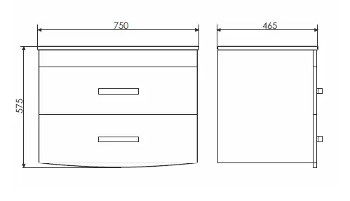 Подвесная тумба-умывальник шириной 75 см с двумя ящиками, оснащенными системой плавного закрывания. Фасады и боковые стенки покрыты белой глянцевой эмалью.