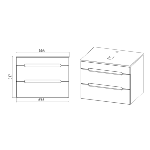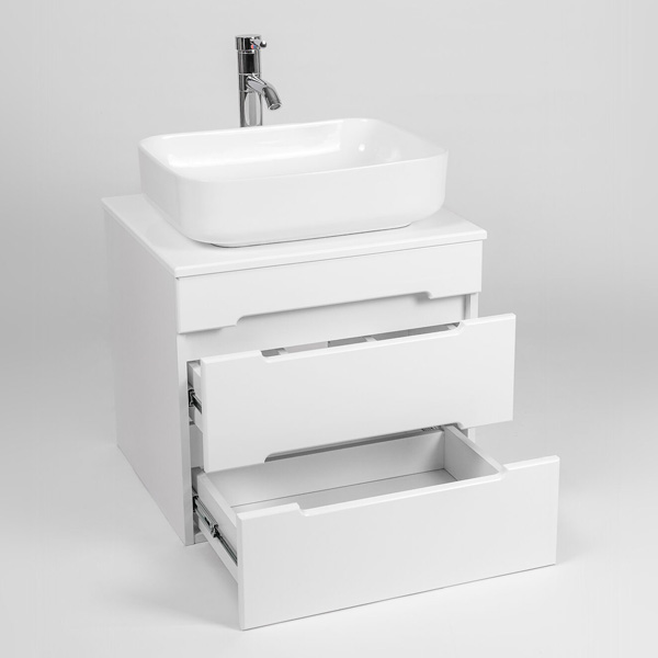 Белая подвесная тумба-умывальник Виант Марсель со столешницей L66 и двумя ящиками - укомплектована керамической раковиной Cersanit Moduo Square 50