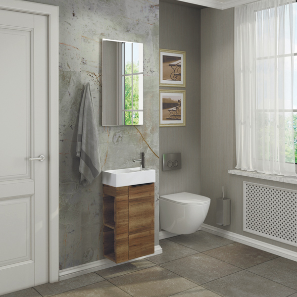 Компактная подвесная тумба-умывальник Comforty Матэ для небольших санузлов. Фасад и корпус тумбы изготовлены из влагостойкого ДСП в декоре «дуб темно-коричневый». Этот декор при прикосновении дарит ощущение натуральной древесины. В комплекте асимметричная раковина с отверстием под смеситель справа. На левом торце тумбы - полки.