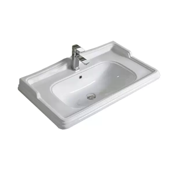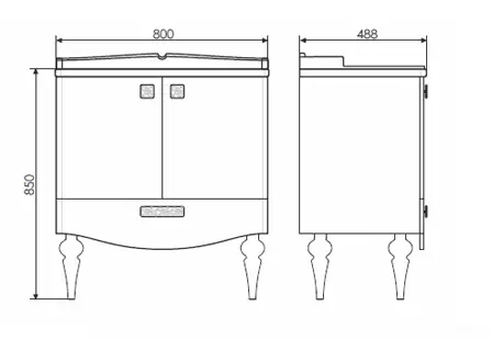Тумба-умывальник в неоклассическом стиле с двумя створками. Створки оснащены петлями с плавным закрыванием. Фасады тумбы покрыты белой глянцевой эмалью. Тумба укомплектована широкой и глубокой раковиной в классическом стиле с бортиком по периметру.
