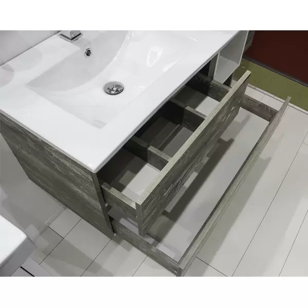 Тумба-умывальник в современном стиле с двумя широкими выкатными ящиками и пространством для открытого хранения. Ящики оснащены системой с плавным закрыванием. Тумба укомплектована накладной прямоугольной раковиной из санфаянса. Чаша раковины смещена влево.