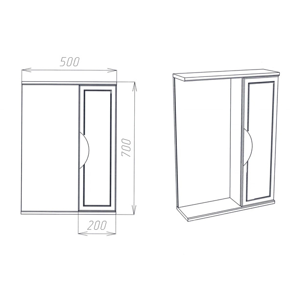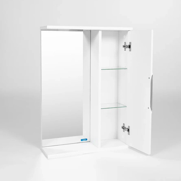 Подвесной зеркальный шкаф шириной 50 см для ванной комнаты с одной створкой. За створкой две стеклянные полки. Фасад створки фрезерован по периметру.