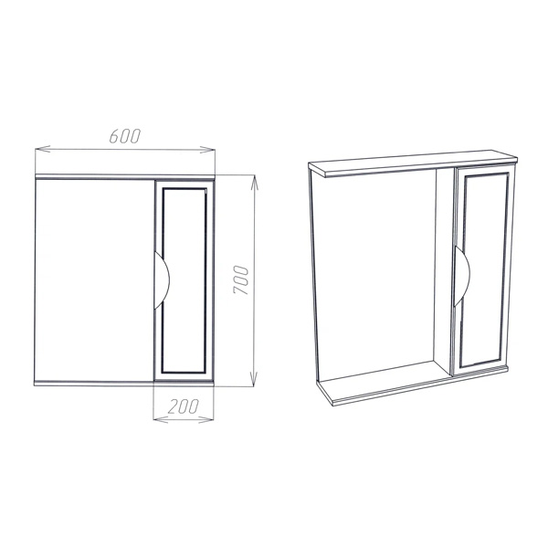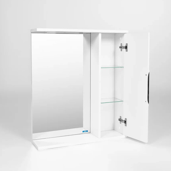 Подвесной зеркальный шкаф шириной 60 см для ванной комнаты с одной створкой. За створкой две стеклянные полки. Фасад створки фрезерован по периметру.
