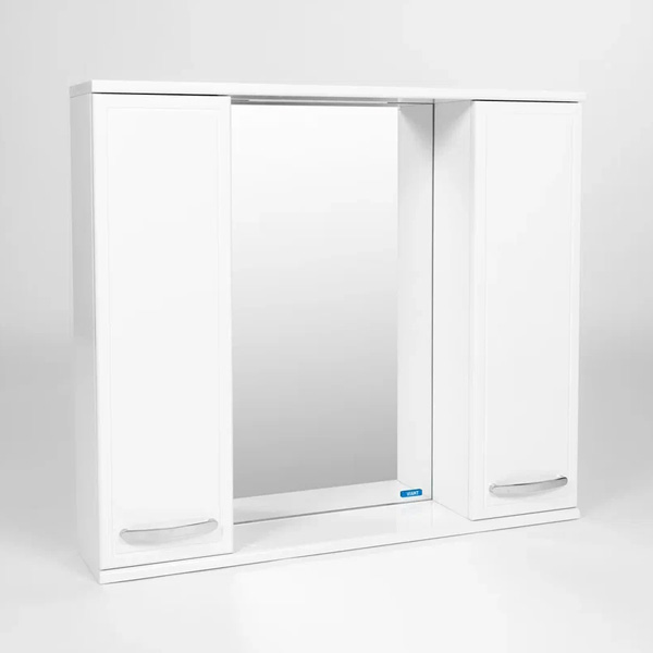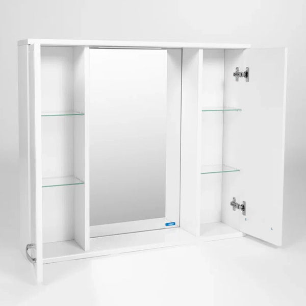 Подвесной зеркальный шкаф Виант Милан шириной 80 см для ванной комнаты с двумя створками. За створками по две стеклянные полки.