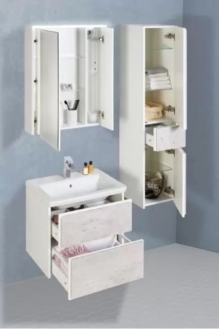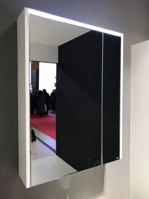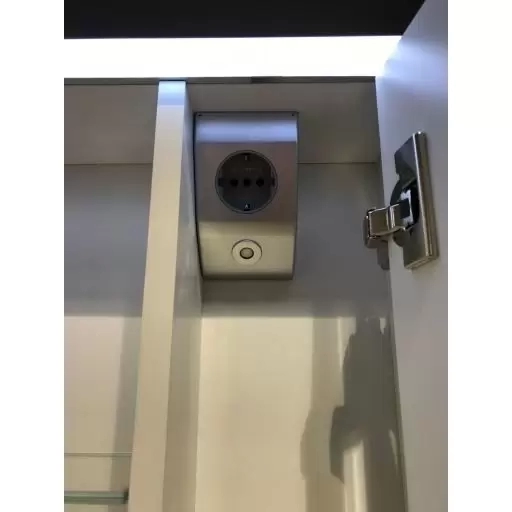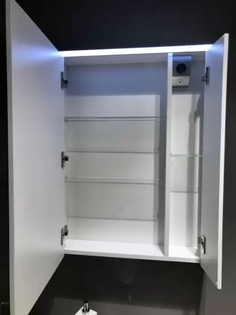 Зеркальный шкаф оснащён светодиодной подсветкой, розеткой IP - 44, сенсорным выключателем с возможностью регулировки яркости.