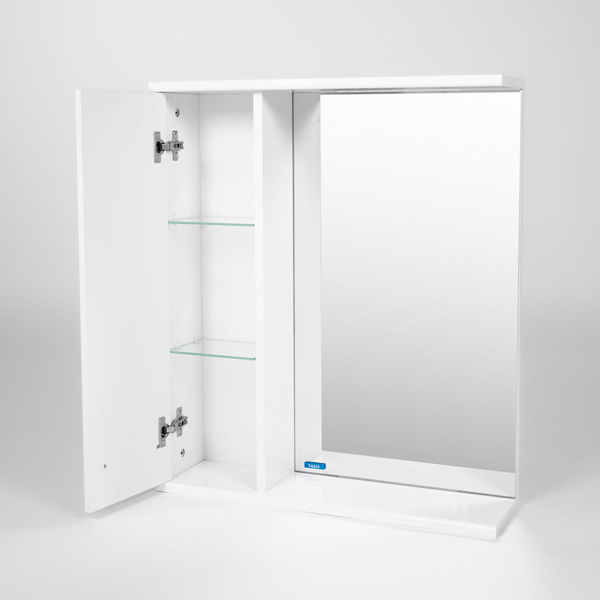 Подвесной зеркальный шкаф Виант Вена шириной 60 см для ванной комнаты с одной створкой. Петли створки слева. За створкой две стеклянные полки.