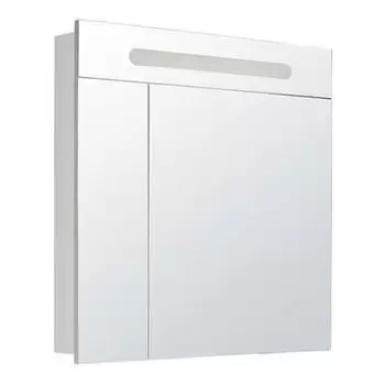 Зеркальный шкафчик с внутренней подсветкой, двумя распашными дверцами, и четырьмя полочками внутри.