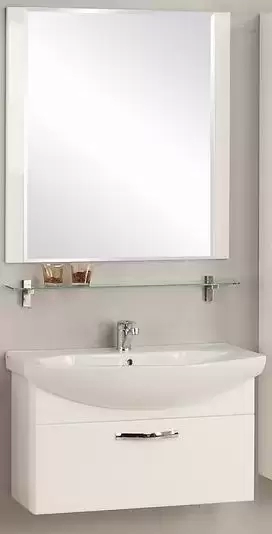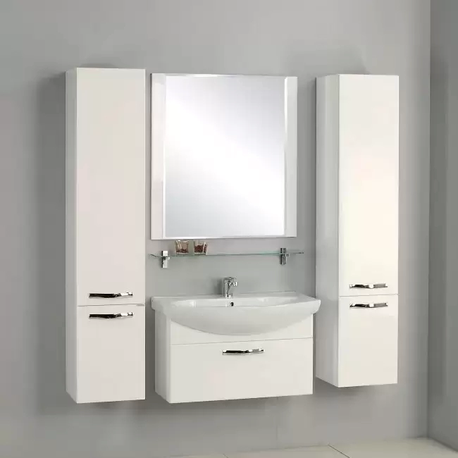 Набор «Ария 80» состоит из подвесной тумбы, зеркала и подвесного шкафа-колонны. Зеркало выполнено в популярном стиле минимализма, не занимает много места и при желании может быть укомплектовано стеклянной полкой "Ария 80".