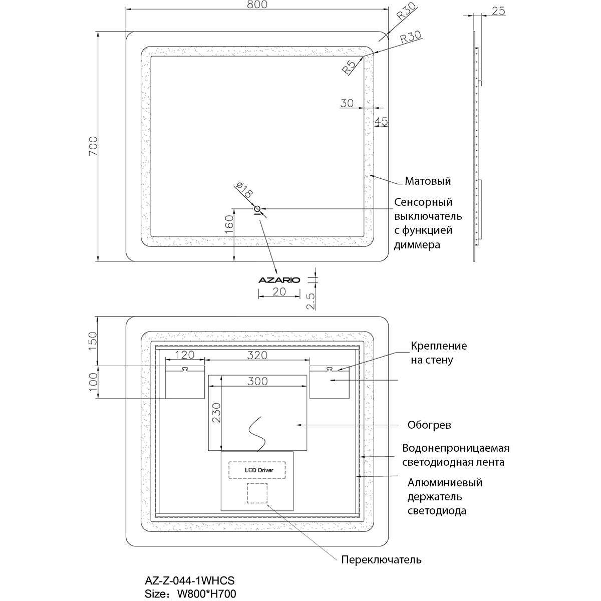 Бренд: Azario; Страна производитель: Китай; Встроенные часы: Нет; Высота зеркала в мм: 700; Ширина зеркала в мм: 800