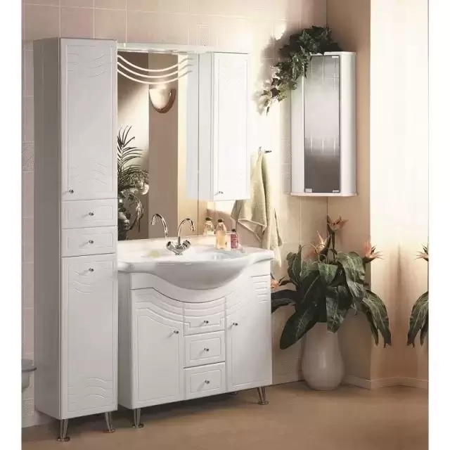 Большая удобная модель, выполненная в традиционном стиле. Зеркальное полотно с влагостойкой амальгамой. Зеркало с гравировкой оснащено подсветкой и шкафчиком, который может быть расположен справа или слева.