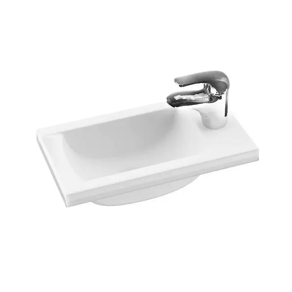 Из литого мрамора, рекомендуется для установки в туалете, а так же в самых маленьких ванных комнатах.