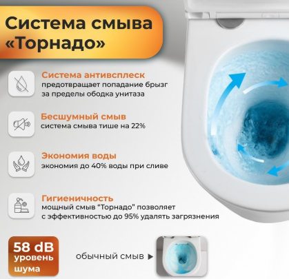 Организация смыва "воронка-водоворот" — обеспечивает эффективное очищение чаши при минимальном расходе воды.