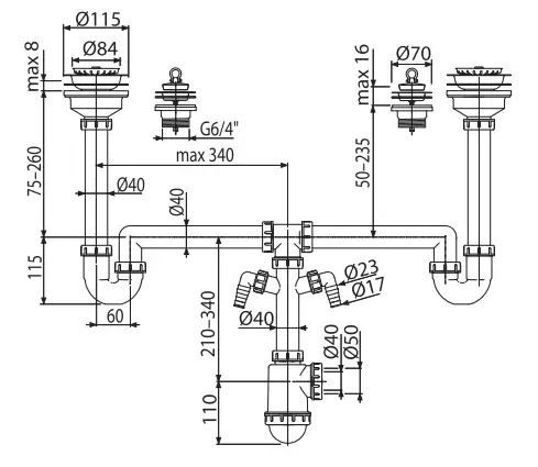 - Возможность подключения канализационной трубы Ø50 мм или Ø40 мм
