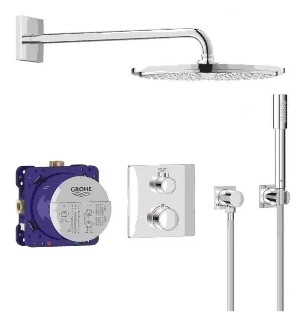 Набор для комплектации душа GROHE Grohtherm включает в себя встраиваемый термостат с переключателем верхний-ручной душ, квадратная розетка, верхний душ RSH Cosmo 310 с кронштейном, ручной душ Sena с подключением и шлангом.