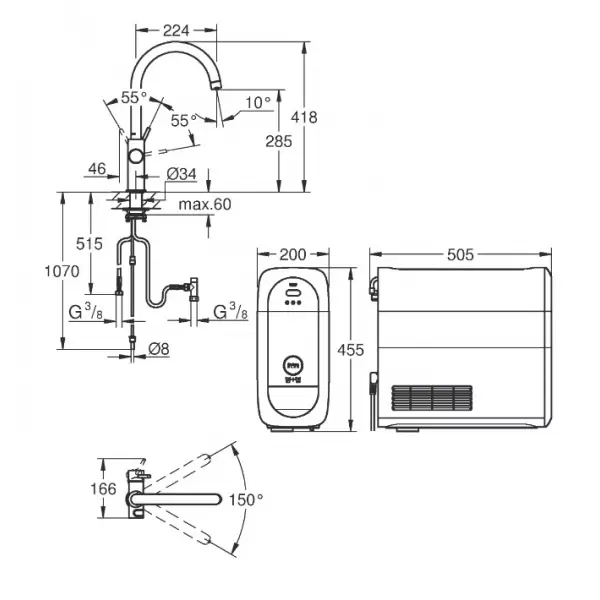 GROHE Blue Home Стартовый комплект включает в себя: GROHE Blue Home Смеситель однорычажный для мойки с функцией очистки водопроводной воды отдельная рукоятка для 2х видов фильтрованной и охлажденной столовой воды негазированная и газированная C-излив отдельные водотоки для питьевой и водопроводной воды гибкая подводка GROHE Blue Home охладитель-карбонизатор Охладитель-карбонизатор 270 Вт, 230 V, 50 Hz обеспечивает 5 л охлажденной воды в час регулируется для фильтров GROHE Blue размер S, GROHE Blue на основе активированного угля и GROHE Blue Магний+ Одобрено в СE GROHE Blue фильтр размер S, головка для фильтра с настройкой уровня жесткости воды GROHE Blue® 425 гр. баллон с углекислым газом (CO2).